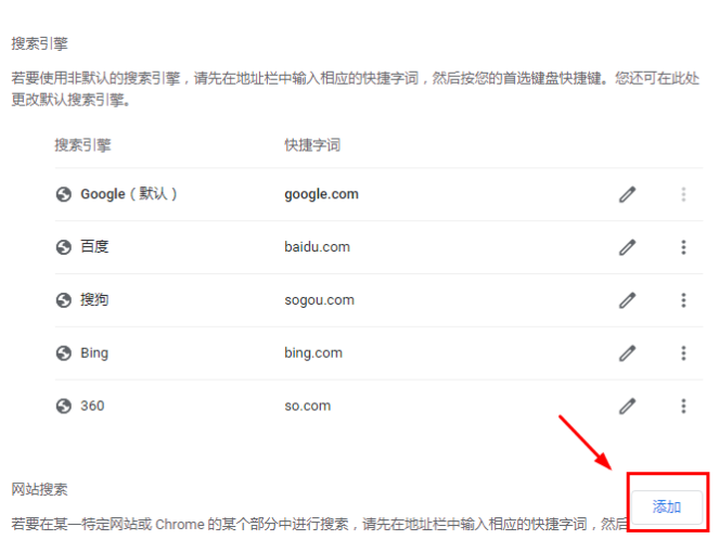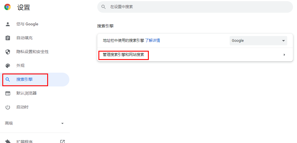 2.设置页——搜索引擎——管理搜索引擎和网站搜索