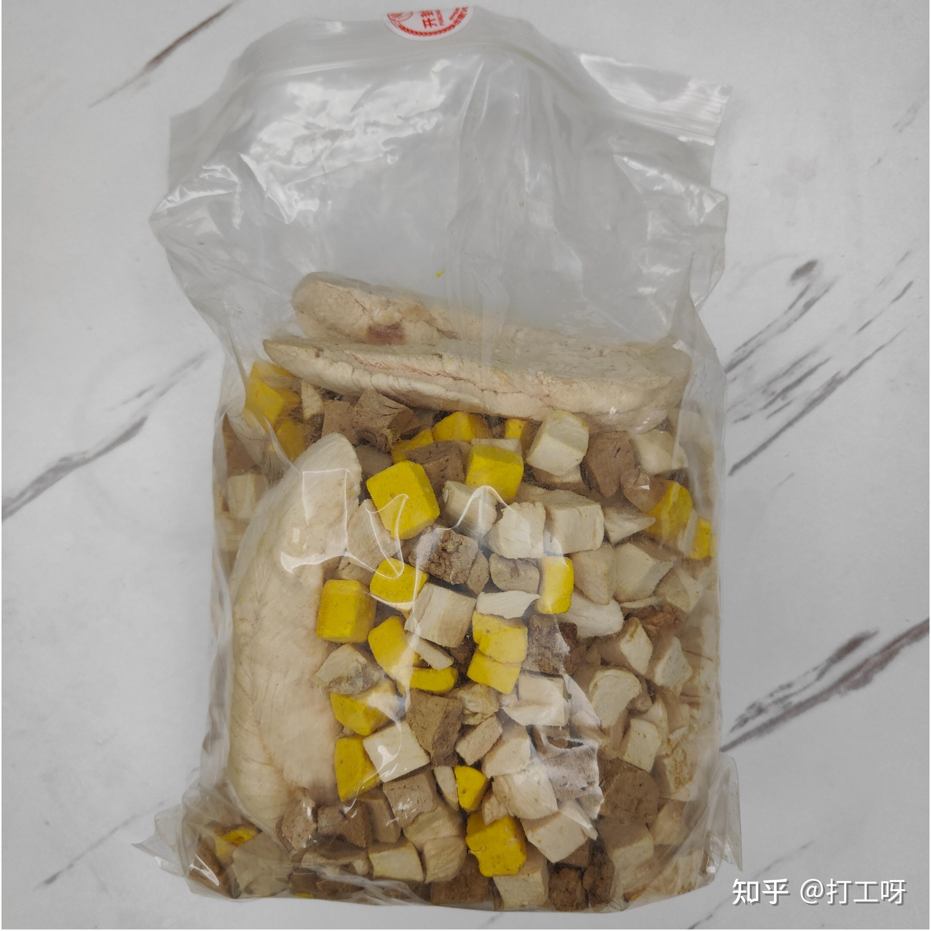 一桶500g重但是日常价才50-60多块钱,但是有30%的鸡胸肉粒冻干、15%的大块鸡小胸冻干和5%的鸭大胸肉,含肉量高达50%。