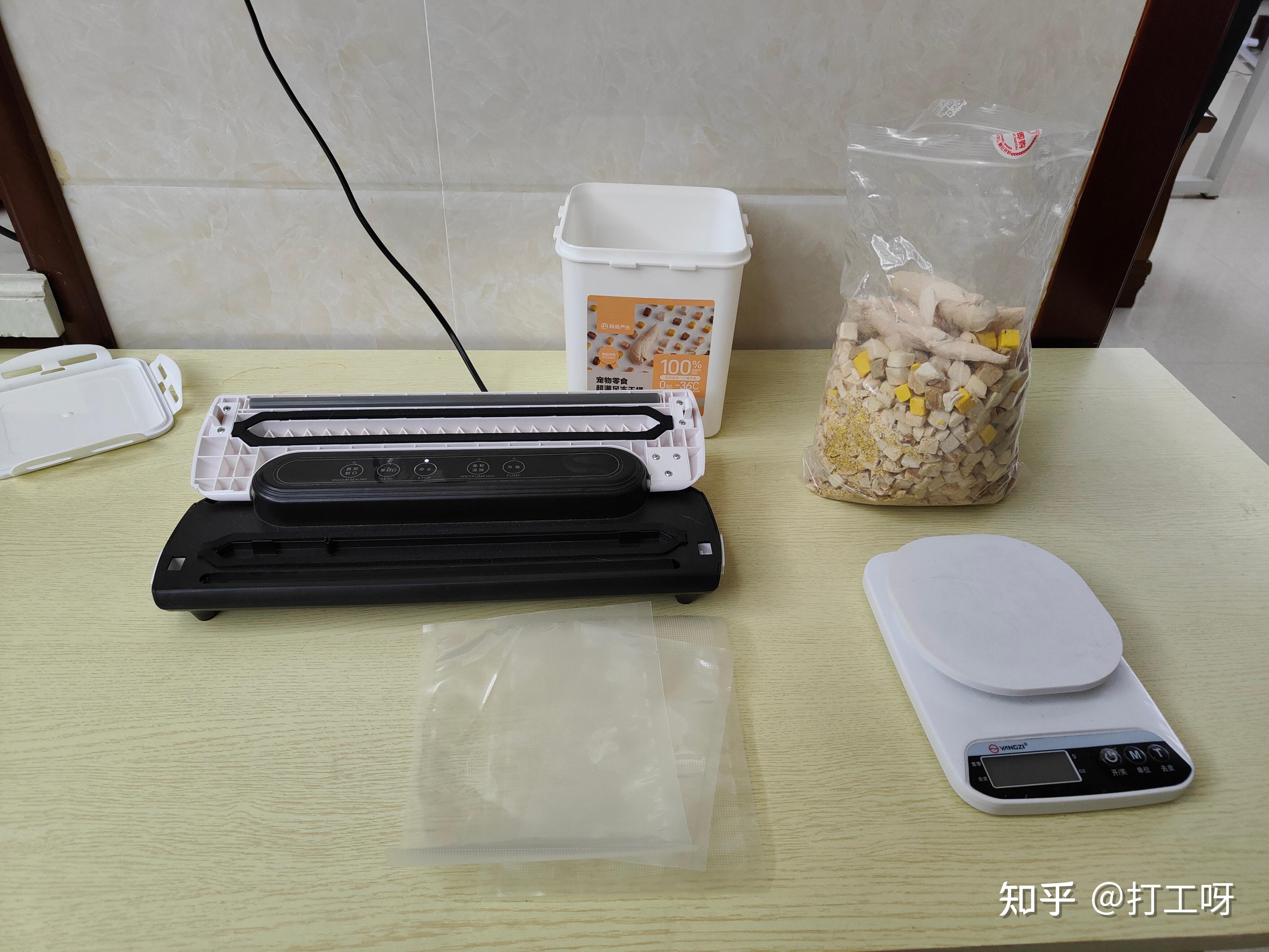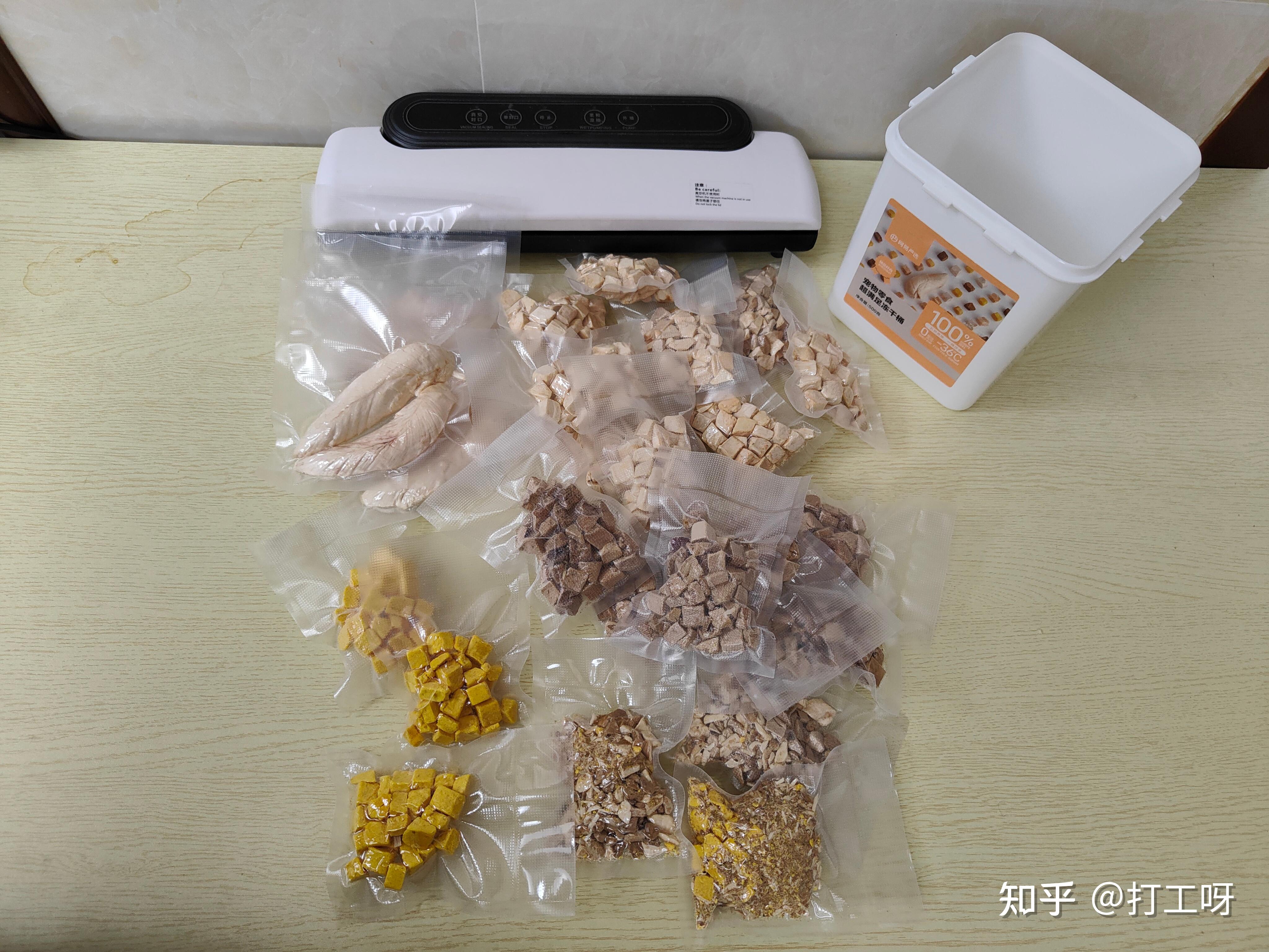 所以我买回来这个冻干桶后,确认肉的品质没有问题,就拿了小真空袋,用真空封装机把它们全部都真空分装了起来,来避免受潮问题。