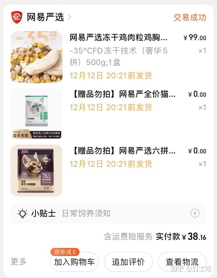 网易严选冻干桶刚好是在做活动,我一顿研究,买下来只要39块钱,冻干有辐照杀菌,足足一斤重,还送两包猫粮试吃,还是有牌子的,这不比一样是买39块钱的三无冻干桶好?果断下单。