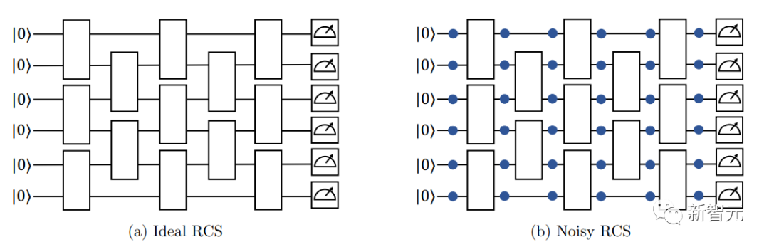 左图为理想状态下的随机电路取样,右图为包含干扰的随机电路取样