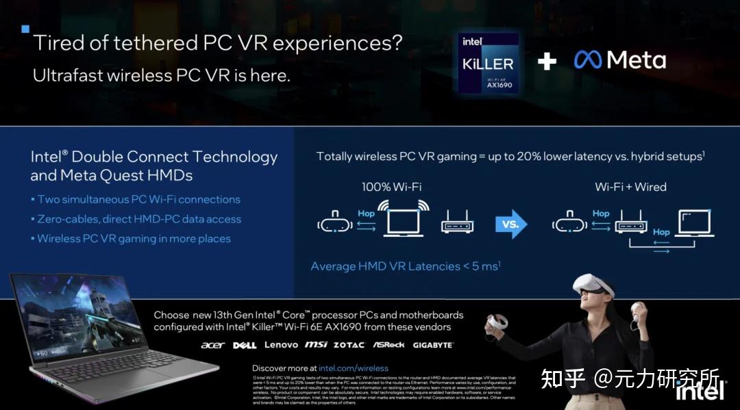 英特尔现在与Meta合作,提供一种新的串联方式,使用其AX1690 Wi-Fi 6E芯片时将利用名为双连接技术(DCT)的新技术,可以让芯片同时保持两个独立的Wi-Fi连接。用户的PC或笔记本电脑可以直接连接到头显,同时仍然通过路由器保持互联网连接。