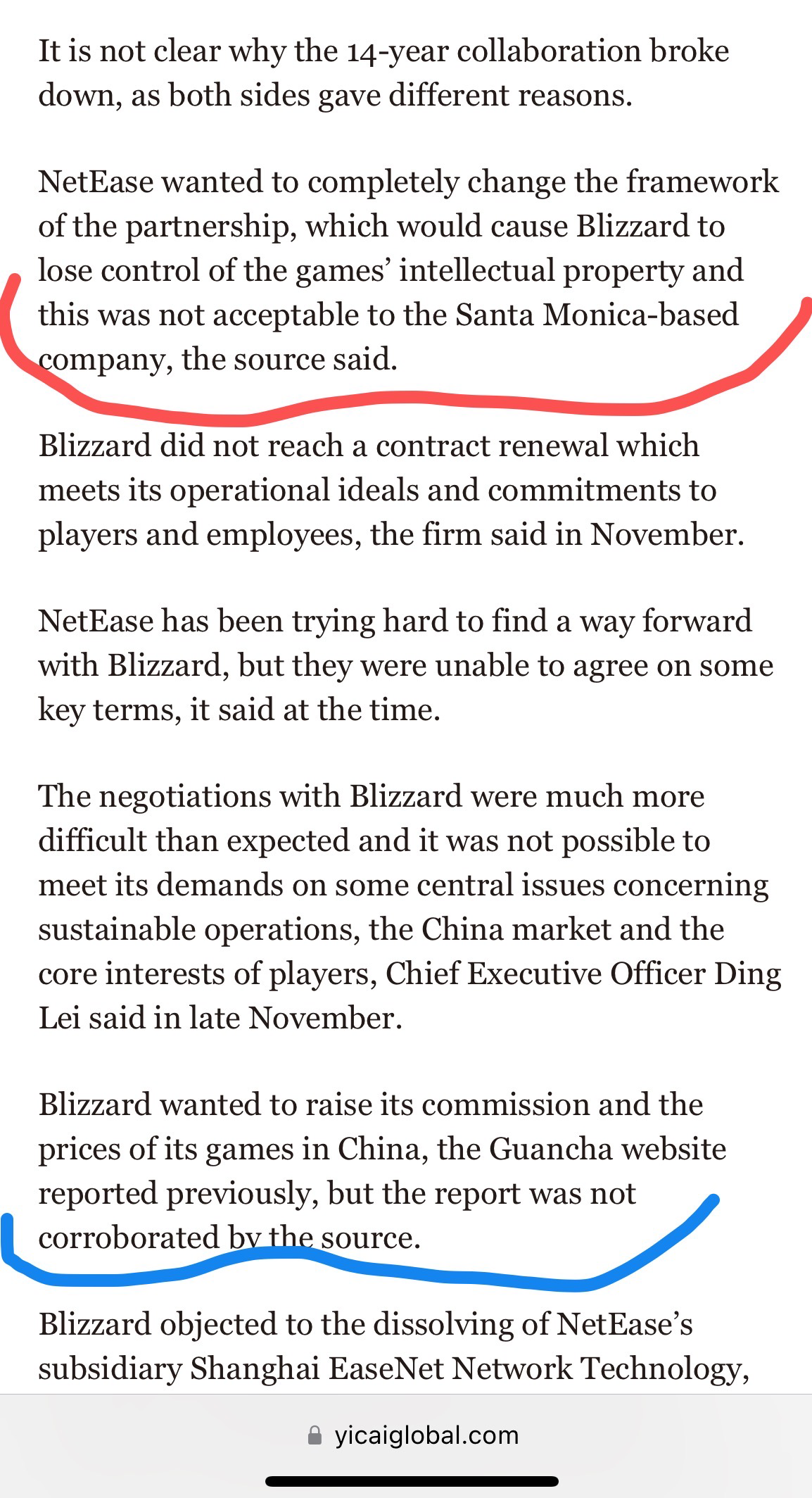 按照“source”说,网易想要完全改变合作机制,会让暴雪失去对IP的控制, 这样对于在美国加州圣莫妮卡地区的暴雪来说是完全不能接受的 (红线部分)