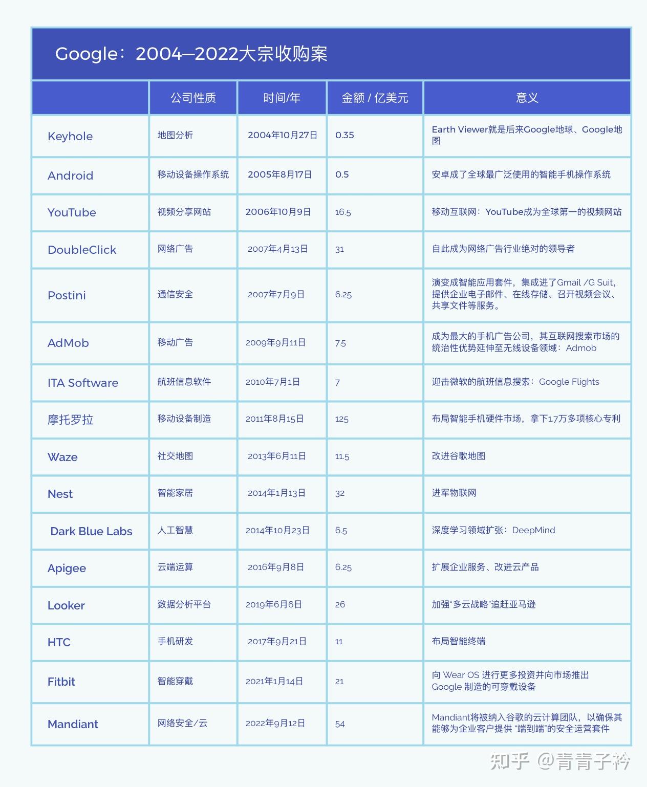 上市后的谷歌逐渐成了巨头,除了稳定搜索的基本盘,还做了巨头公司最擅长的事,对,没错,是并购合作。我们一起看看谷歌的2004到2022的大宗收购案
