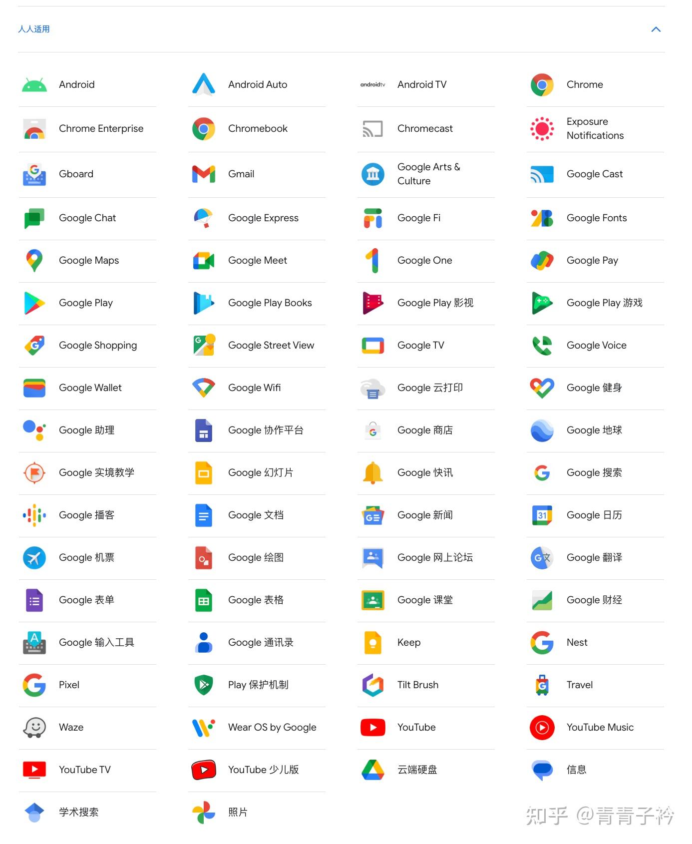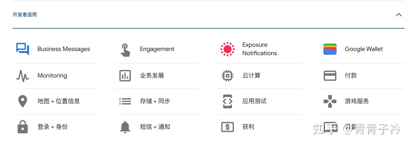 下面是谷歌推出的面向大众、企业、开发者的产品与服务。