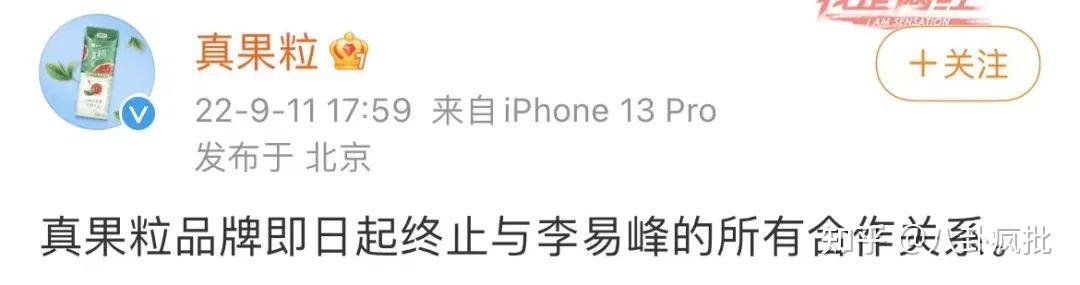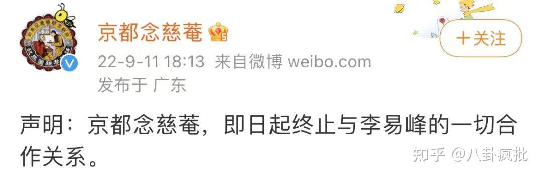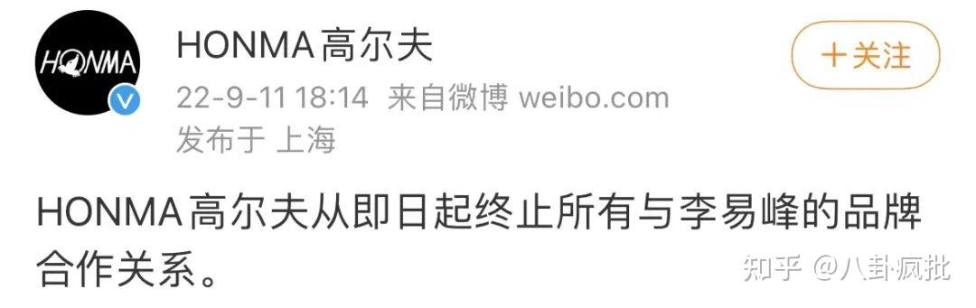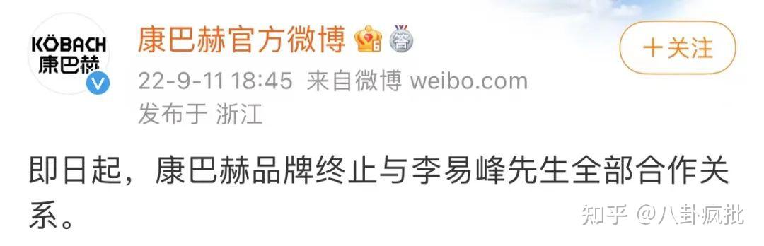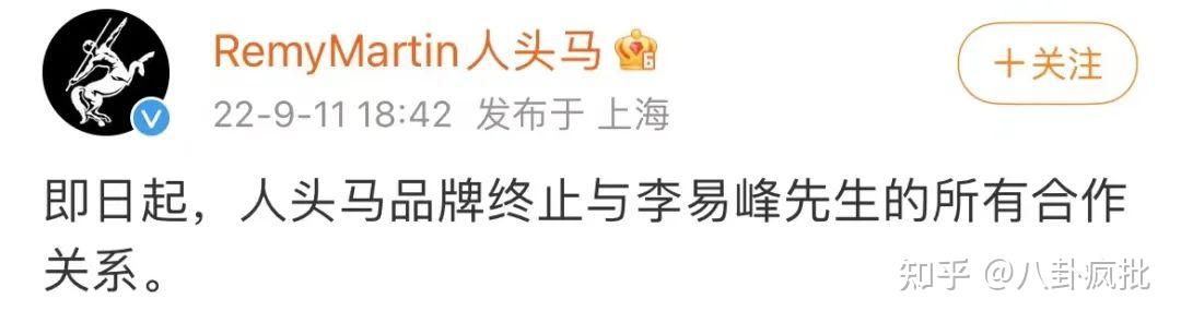 截至9月11日晚19点半,已有真果粒、京都念慈菴、HONMA高尔夫品牌、Panerai沛纳海、Prada普拉达、六福珠宝、舒适达、鸭鸭羽绒服、RemyMartin人头马、康巴赫厨具、王力安防智能锁等多家品牌宣布终止与李易峰的一切合作关系。