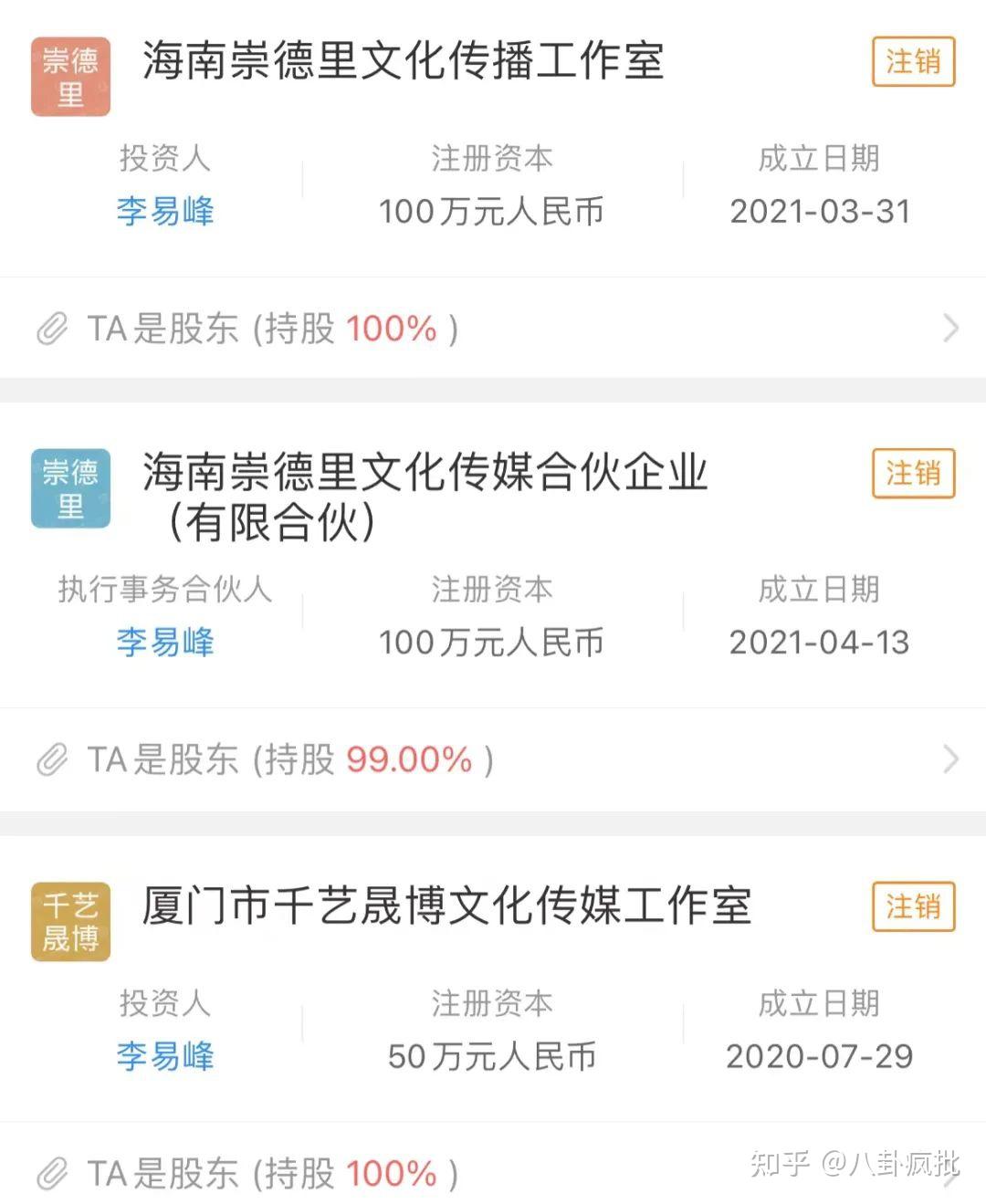 值得一提的是,李易峰3家注销状态的企业均注销于今年3月、4月,其中,厦门市千艺晟博文化传媒工作室注销于3月15日,海南崇德里文化传播工作室、海南崇德里文化传媒合伙企业(有限合伙)于4月12日同一天注销。