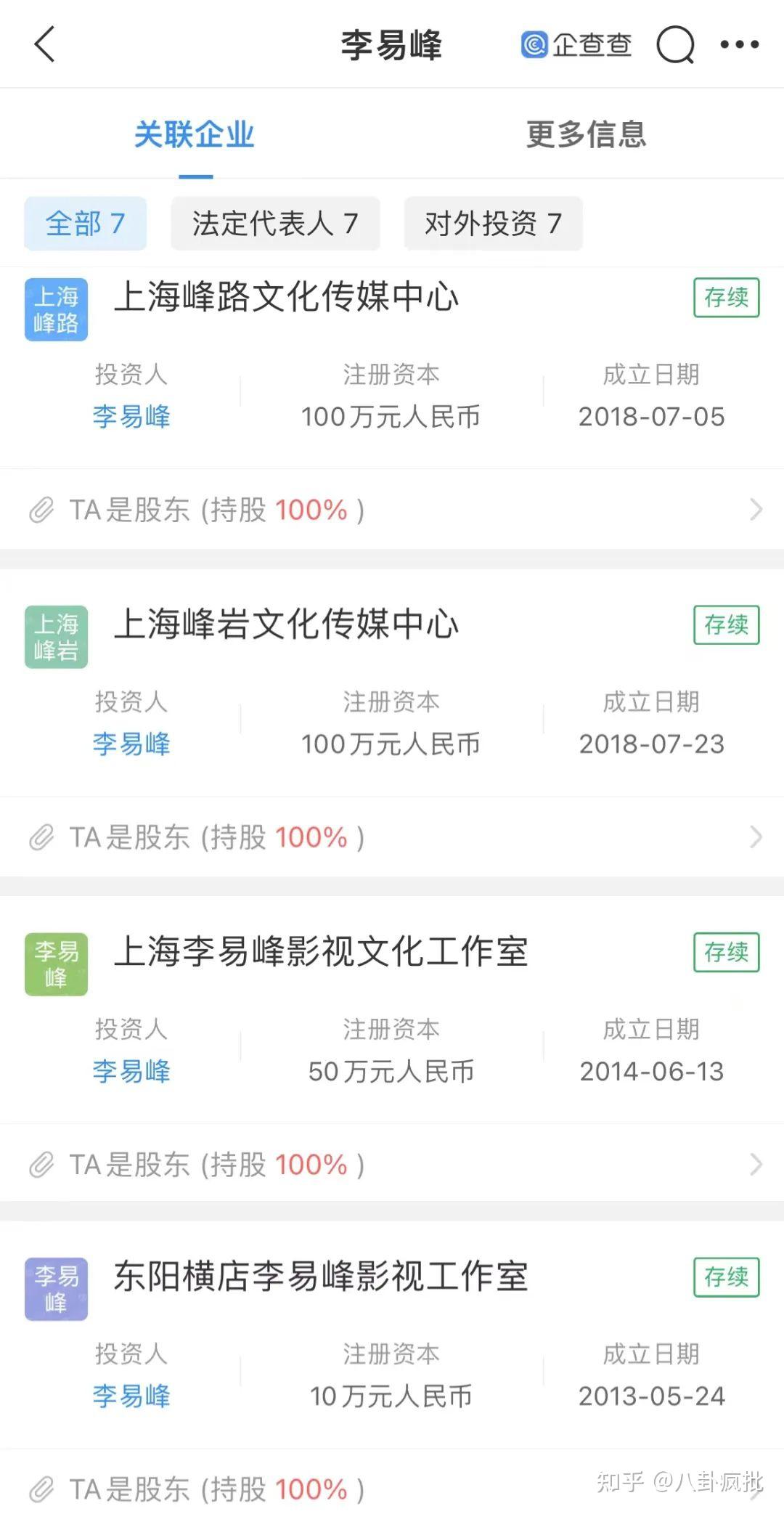 另据企查查显示,李易峰关联公司共7家,目前仅“上海峰路文化传媒中心”“上海峰岩文化传媒中心”等四家公司存续,均为李易峰个人独资。其中,东阳横店李易峰影视工作室近日被浪莎起诉侵权。