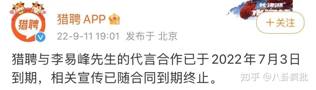 猎聘APP通过官博表示,其与李易峰的代言合作已于2022年7月3日到期,相关宣传已随合同到期终止。