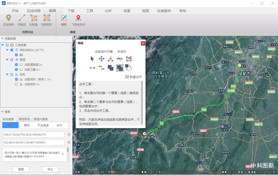 6、【地图标绘】标绘编辑,点线面编辑图新地球都支持,还支持各种复杂的矢量编辑,如:插入节点、删除节点、继续绘制、线面互转、线面分割、线面合并、逆序等各种实用编辑工具,因此数据支持方面,图新地球比谷歌地球强大
