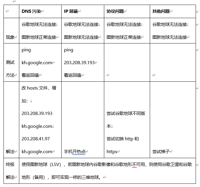针对谷歌地球的常见问题,基本有三种可能性和一种特殊情况,针对不同的情况,有不同的解决方案。因此并不是别人能看,我这里不能看,我换成和别人一样的hosts就能看,要具体问题具体分析,才能对症下药。