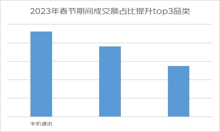 手机通讯、家用电器和医疗保健的成交额占比提升明显;服务消费升级更明显,春节期间生活服务成交额比去年阴历同期增长302%;“兔”年主题珠宝首饰销量同比增长超10倍,礼盒类商品整体销量同比增长超50%,预制菜成交额同比增长超6倍;低线级市场增长潜力足,近三年成交额占比逐年提升。