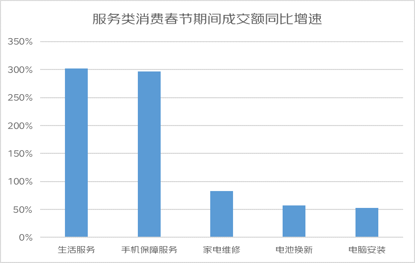 同时,除了在春节期间购买心仪好物外,服务消费也受到了众多消费者的喜爱,春节期间生活服务、手机保障服务、家电维修、电池换新和电脑安装的成交额同比增长分别达302%、296%、83%、57%、53%。