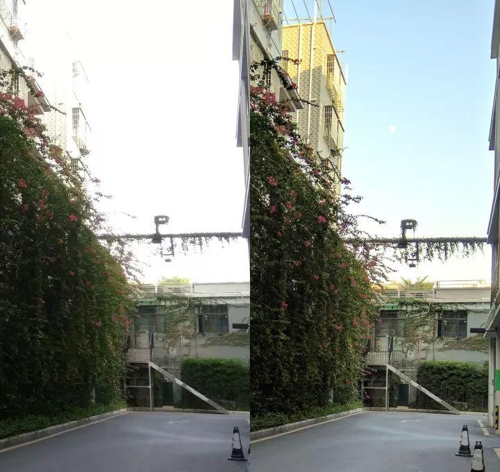 以下面对比样张来看,系统相机拍摄的画面中,左侧楼房严重过曝,和白色天空糊成一片;而谷歌相机则表现正常,楼房清晰可见,蓝色天空也准确还原出来。