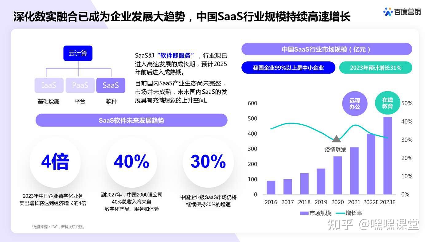 2023年中国企业数字化业务支出增长将达到经济增长的4倍,到2027年,中国2000强公司40%总收入将来自数字化产品、服务和体验,中国企业级SaaS市场仍将继续保持30%的增速。