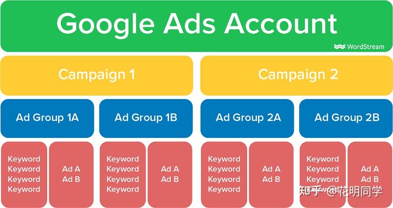 而关于谷歌广告,其主要是由三个的基本元素,即由最底层的关键字、广告和相关着陆页组成。其通过广告账户内的广告组(ad group),形成相互关联。广告组又同时分布在一个帐户的一个或多个广告系列(Campaign)中。