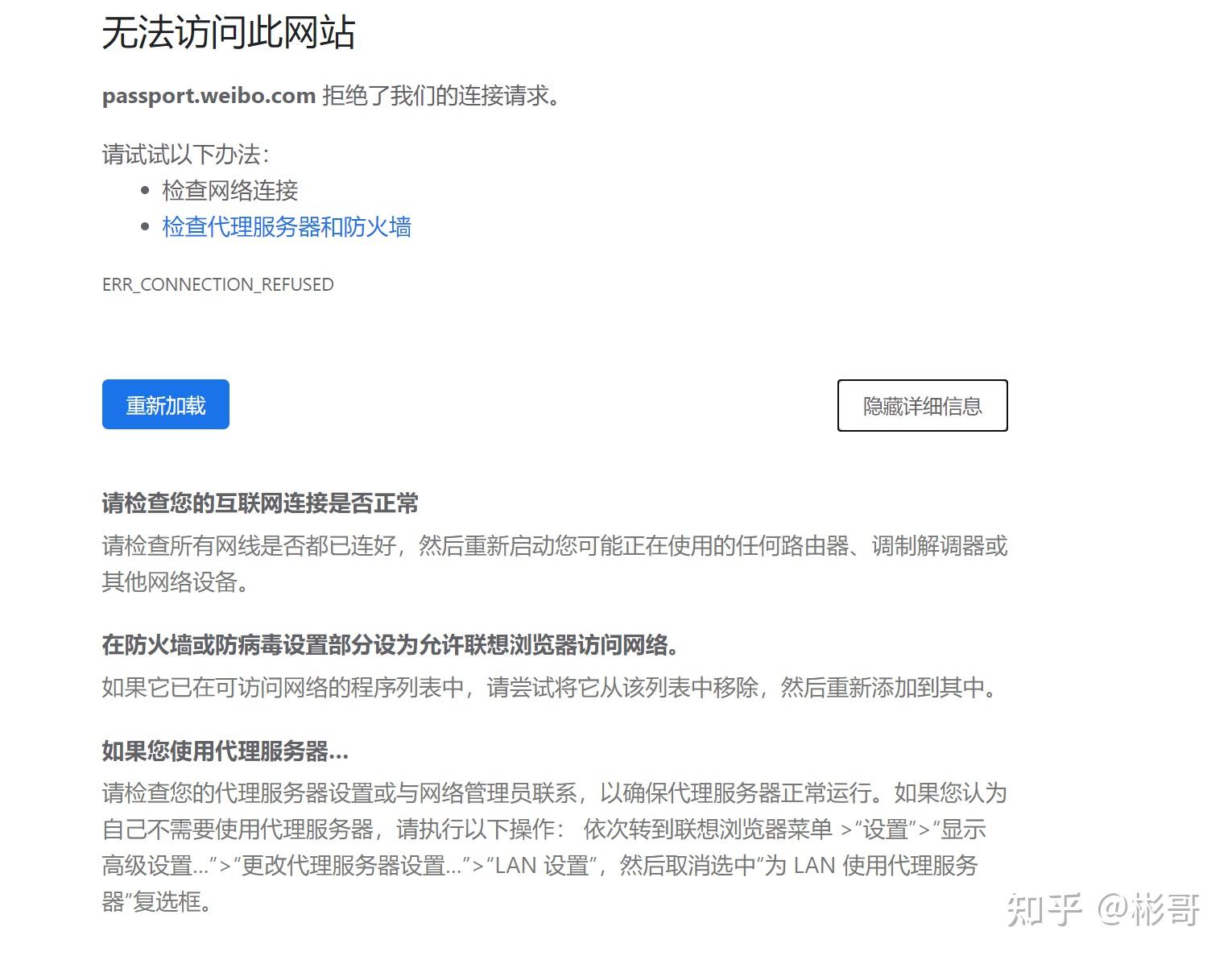 https://weibo.com应该是这个网址。昨天晚上大概10点多的时候才发现进不去了,无论怎么做都没用(图一图二就是唯一能看见的)此前一直用得好好的。而且我用电脑qq、上哔哩哔哩的都很正常,用手机浏览器也能上微博网页版,唯独用电脑上微博网页版就出了问题。我的电脑牌子是“联想小新Pro-14 2021”。