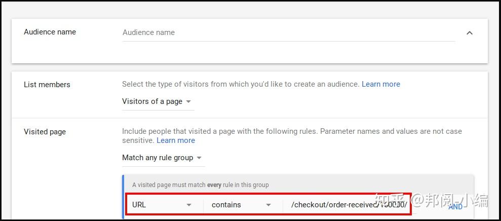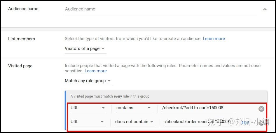 在创建再营销受众群体时,可以选择规则。规则可以包含:“以...开头start with”,“以...结束end with”,填入特定的URL路径。