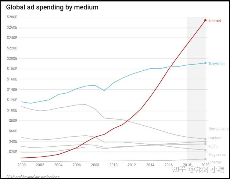 因为包括谷歌和Facebook等等的的广告渠道,广告支出在每年都在攀升。