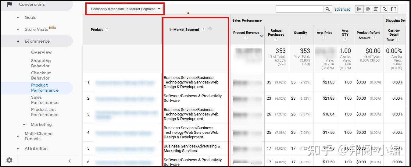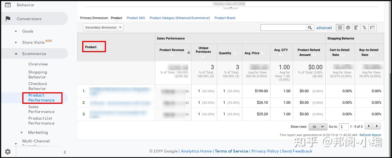 转到Google Analytics查看“电子商务”下的“产品效果Product Performance”标签。
