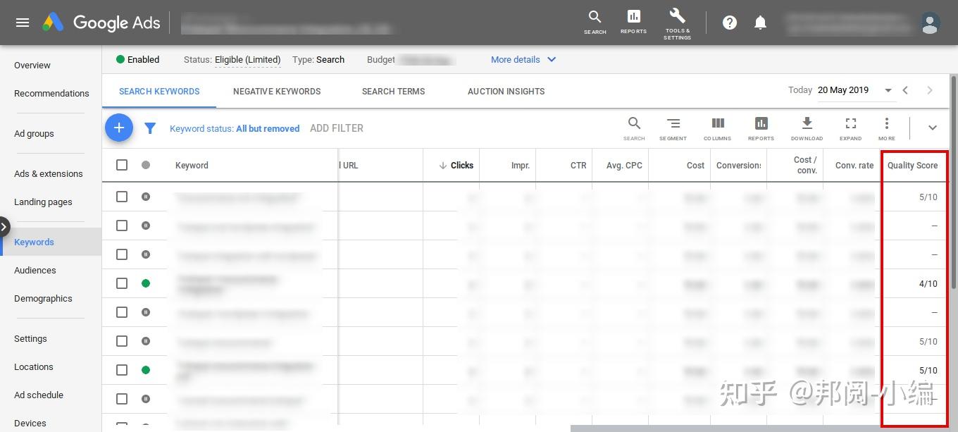 在新的Google广告界面中,需要导航到“关键字”级别,然后查看相应关键字的质量得分列。
