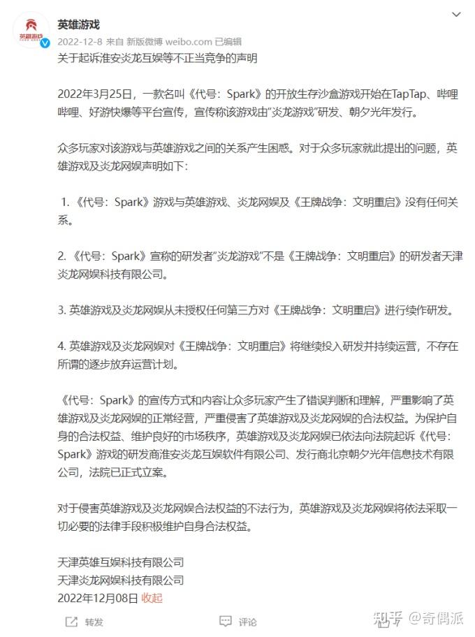 去年朝夕光年发行的开放生存沙盒游戏《代号:SPARK》,官宣开发商炎龙游戏,还被英雄互娱指责蹭热度。