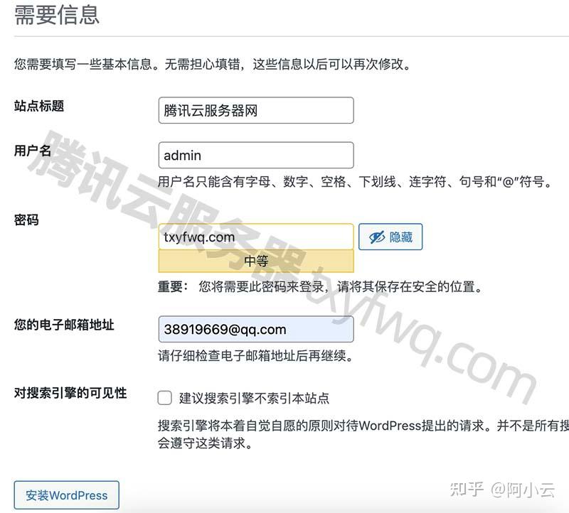 继续点击“运行安装程序”,在WordPress欢迎页面,填写站点标题、用户名、密码及电子邮件等信息: