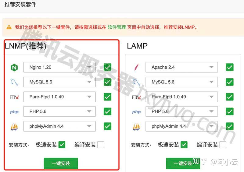 点一键安装,宝塔面板默认Web安装程序Nginx 1.20、MySQL 5.6、Pure-Ftpd 1.0.49、PHP 5.6、phpMyAdmin 4.4。