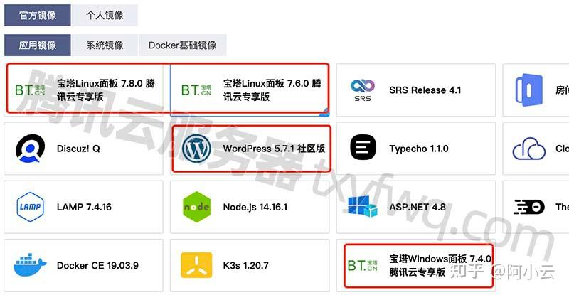 在腾讯云服务器的“镜像市场”中,可以选择已经带有Web环境的市场镜像。如果是轻量应用服务器,直接提供WordPress镜像,如下图: