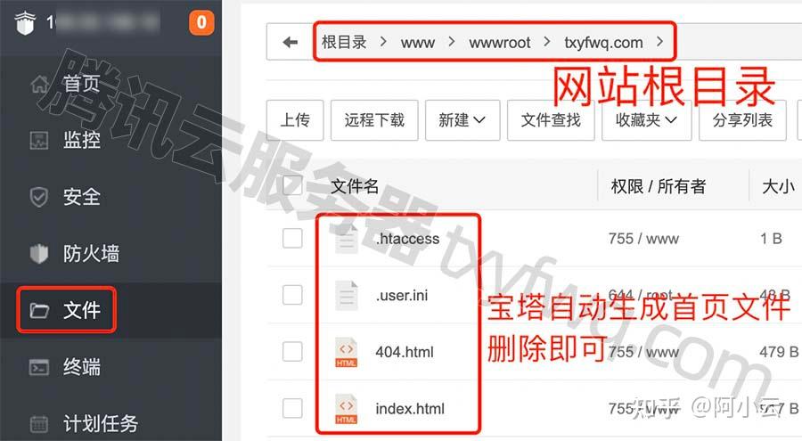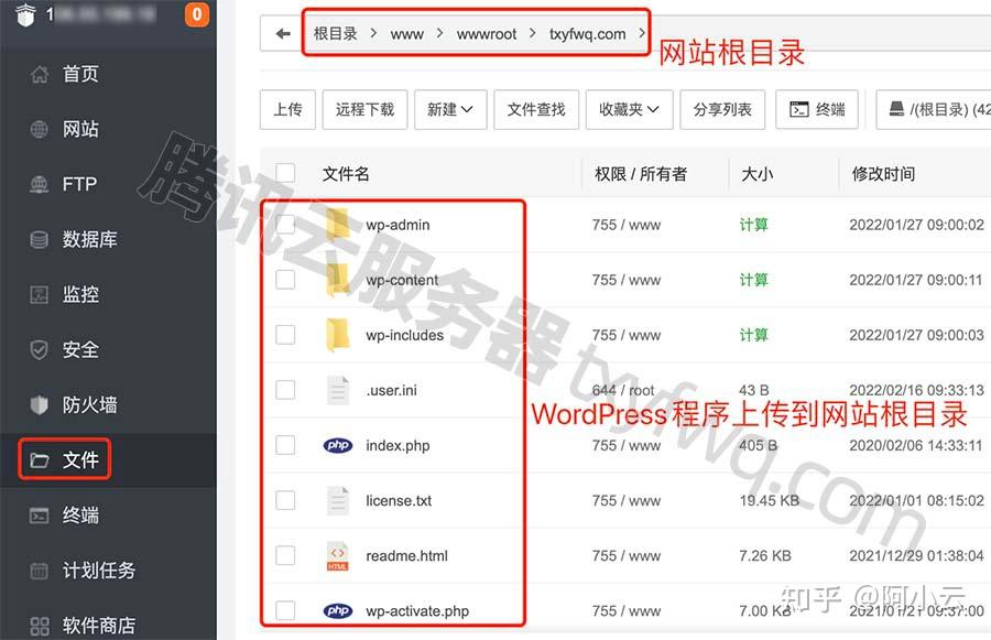 宝塔面板选择左侧“文件”,腾讯云服务器网易http://txyfwq.com这个网站为例,将WordPress网站程序上传到/www/wwwroot/txyfwq.com这个目录下,如下图: