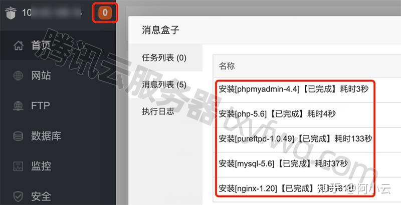 等待云服务器自动安装即可,安装时间取决于云服务器配置及网络带宽,在消息盒子中会有安装进度,如下图: