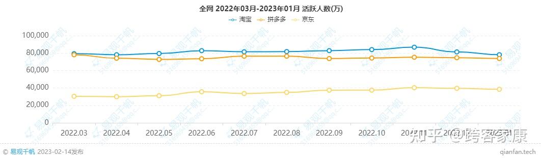 事实上,上线百亿补贴频道及去年刘强东强势回归的背后,是京东当前正面临的严峻形势。若仅从月活的角度来看,作为国内老牌电商平台之一的京东,目前已被同行的淘宝、拼多多拉开不小的差距。易观千帆数据显示,去年3月至今年1月期间,淘宝的月活均在7.8亿以上,牢牢占据着月活冠军的位置;紧随淘宝之后的,则是月活大致维持在7.2亿至7.8亿区间的拼多多;与之对应的是,京东的月活基本均在3亿至4亿的区间内徘徊,在此期间京东只有去年11月的月活短暂地超过4亿。