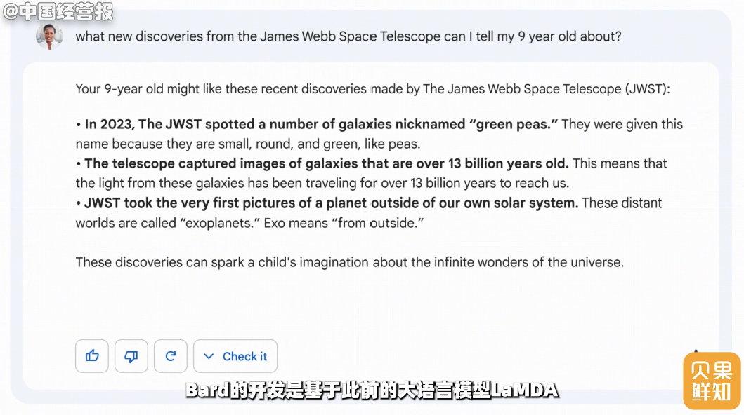 根据皮查伊的博文,Bard的开发是基于此前的大语言模型LaMDA,与只有2021年前数据的ChatGPT不同,Bard的答案来自于实时网络数据。