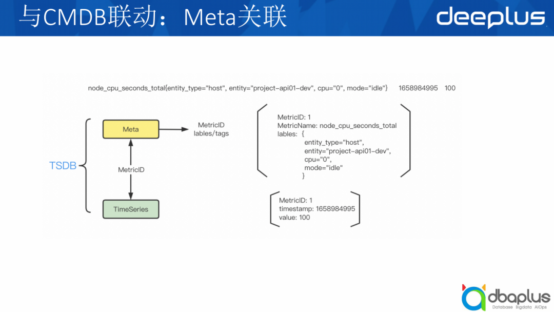 TSDB分为两个模块,第一个是Meta信息,我们可以看到最上面一条例子,它是一个指标,后面是它的时间戳和值,Meta信息会包括指标名、labels。下面一部分是它的时序数据,timestamp和value就存在这边,中间通过一个ID关联起来。