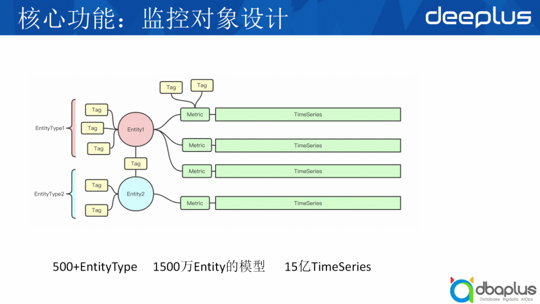 我们把监控对象抽象为Entity,用EntityType描述它是属于什么类型的,用Tag描述它的属性。同时tag也会有一个类似交叉表的用途,把entity关联在一起,比如机器是一类实体,进程是一类实体,而具体的机器名如hostname01是机器的一个Entity,正在运行的agent进程是进程的一个实体,最终我们可以通过Entity或Metric的tag过滤到我们期望得到的TimeSeries(时序数据)。目前我们大概有500+个EntityType,1500万Entity实体模型,覆盖了大约15亿的时序指标。
