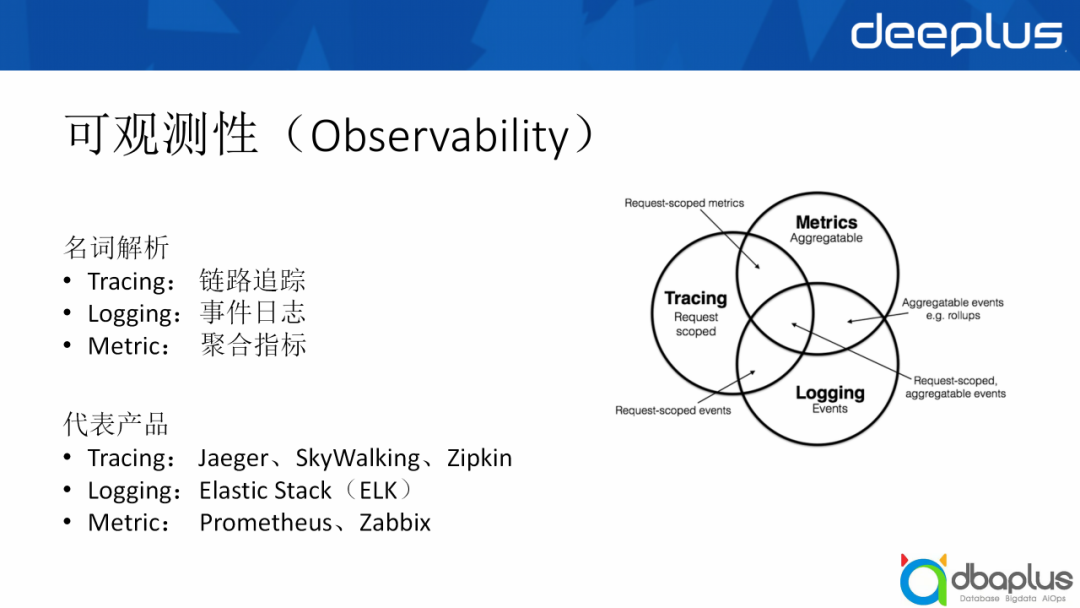 在开始进入主题之前,我想先给大家科普一个名词——可观测性,它主要有Tracing(链路追踪)、Logging(事件日志)、 Metric(聚合指标)三个大部分,我今天分享的主题主要围绕的是Metric部分。