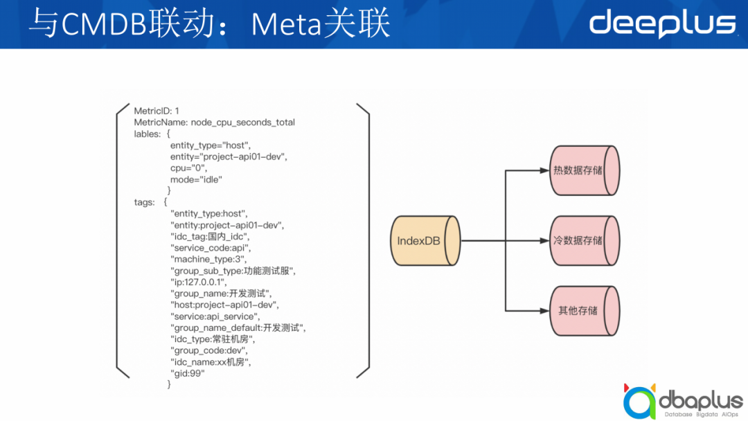 刚才讲到我们的Entity和Metric都会有tag,而这些tag就包括我们内部的CMDB属性,比如右侧图。我们是将这些tag单独存了一份,与Metric的tag是分开的。它会把指标与TSID去做索引,最后是tag与MetricID去做索引,每一个tag它都会去做一遍索引。