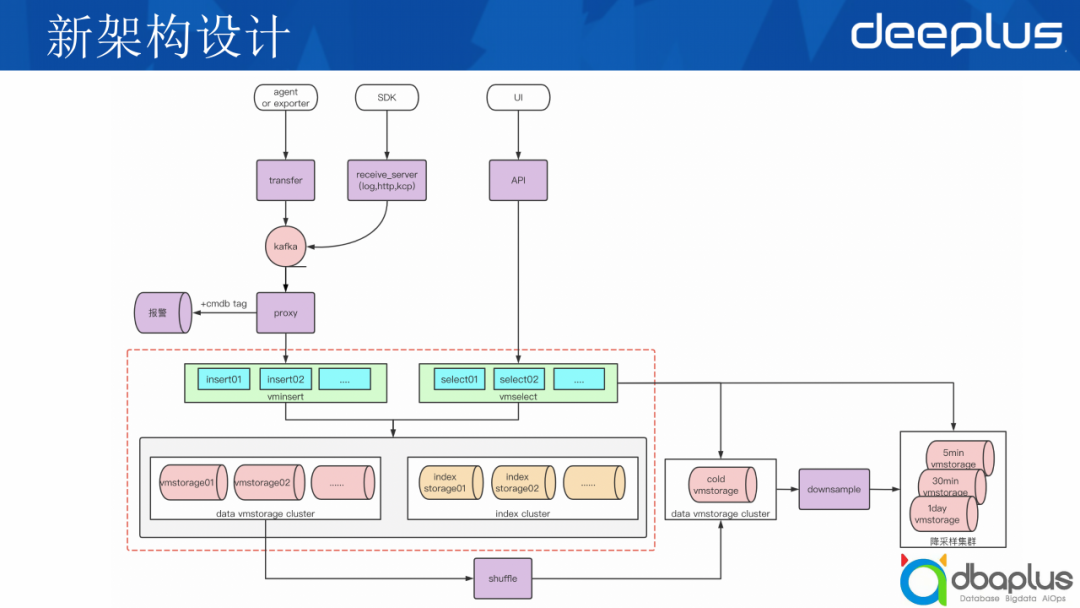 上面主要是一些API和UI的模块,底部我们可以看到右边有一个冷数据的存储节点,这一块会写入到冷数据,data集群里我们增加了一个Shuffle模块,它负责解析vm的文件,将同一个指标的所有时序数据发送到冷数据存储,然后由downsample降采样模块进行降粒度存到冷存储集群中。Data cluster有多套,而index cluster是公用一套,从而降低存储成本。
