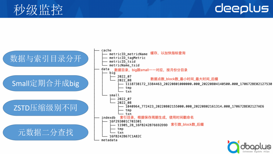 首先介绍一下VictoriaMetrics的目录结构,它把数据和索引分开了,data是它的数据目录,indexdb是它的索引目录。