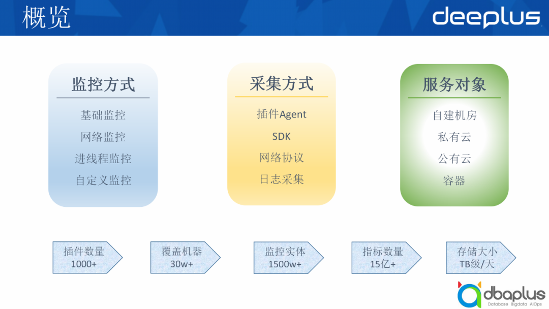 上图也列举了我们目前的量级,我们现在的监控实体有1500万,总的持续指标数量达到了15亿。