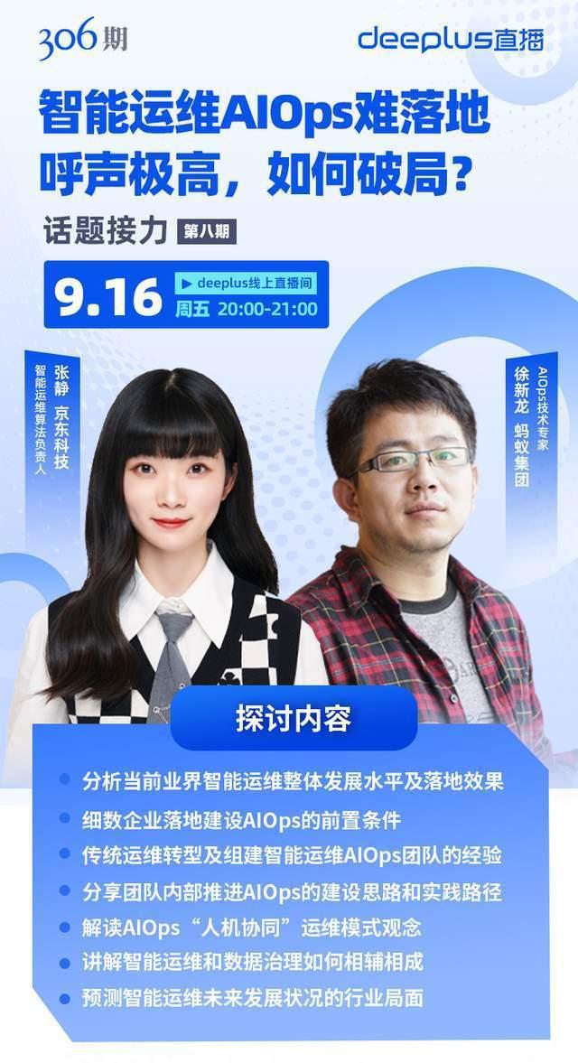 开播,dbaplus社群邀请到京东科技 智能运维算法负责人-张静、蚂蚁集团 AIOps技术专家-徐新龙在云上汇聚,希望通过汇集两位运维专家的研究成果和实践积累,给大家进一步明确智能运维发展的方向,提供可参考、可落地的智能运维实战经验。