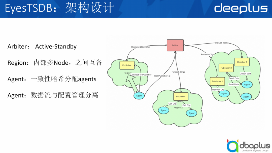 右边的图是一个服务端监控的基础架构。当CMDB发生变更时,Arbiter会去订阅变更,然后生成一个最新的配置,下发到Region区域,比如Publisher收到变更之后,会同步到agent去询问,agent会询问Arbiter:我应该到哪一个Publisher上报数据?然后Arbiter会告诉它所属的Region和Publisher列表,agent尝试连接,成功就会入网,它会与Publisher保持一个⻓链接,把它产生的数据全部交给Publisher去中转。Publisher到中央我们会做网络优化,比agent直接连到中央会快很多。