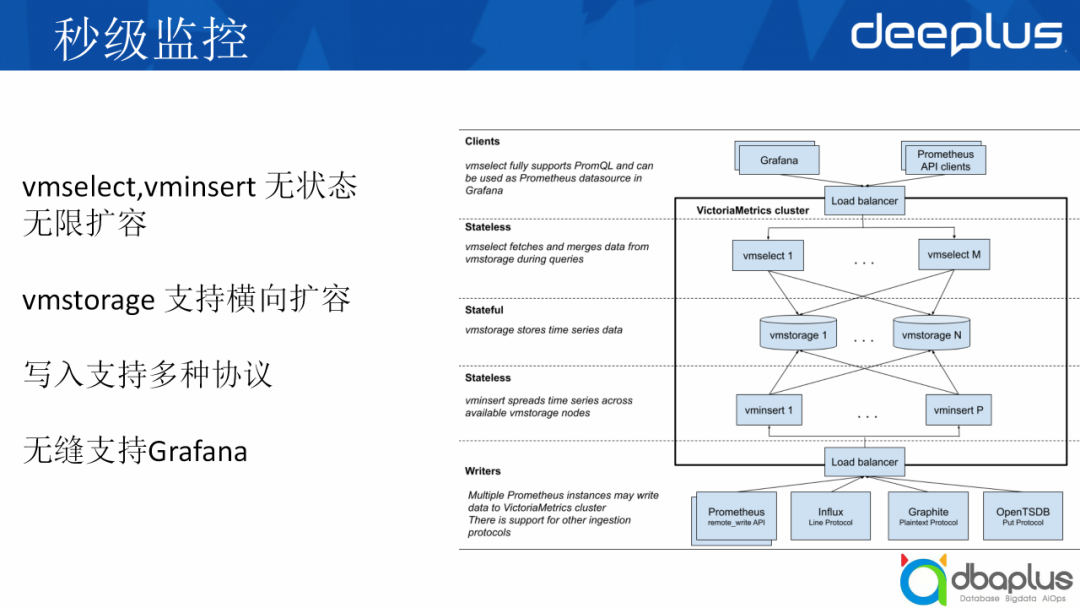 右边的图是它的整体架构,我们可以从中间看起,中间主要是存储,上下分别是查询和写入,它的查询是vmselect,协助是vminsert,两者是没有状态的,我可以随时扩增节点。
