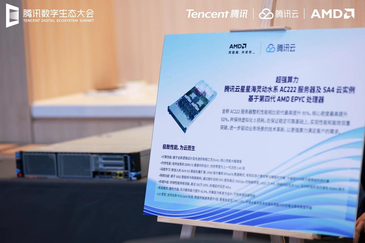 北京时间2022年12月1日 - 在2022年腾讯全球数字生态大会上,腾讯云和AMD再次携手给市场带来惊喜,于12月1日举办“同超越,共成就-AMD重‘芯’定义下一代云计算”专场。腾讯云在此次活动上推出了搭载第四代AMD EPYC处理器的星星海自研服务器AC222及云实例SA4,这代服务器的整机性能相比前代最高提升95%、核心密度最高提升50%,并保持虚拟化0损耗。在保证稳定可靠基础上,实现性能和能效双重突破,进一步驱动业务场景的技术革新,以更强算力满足客户的需求。