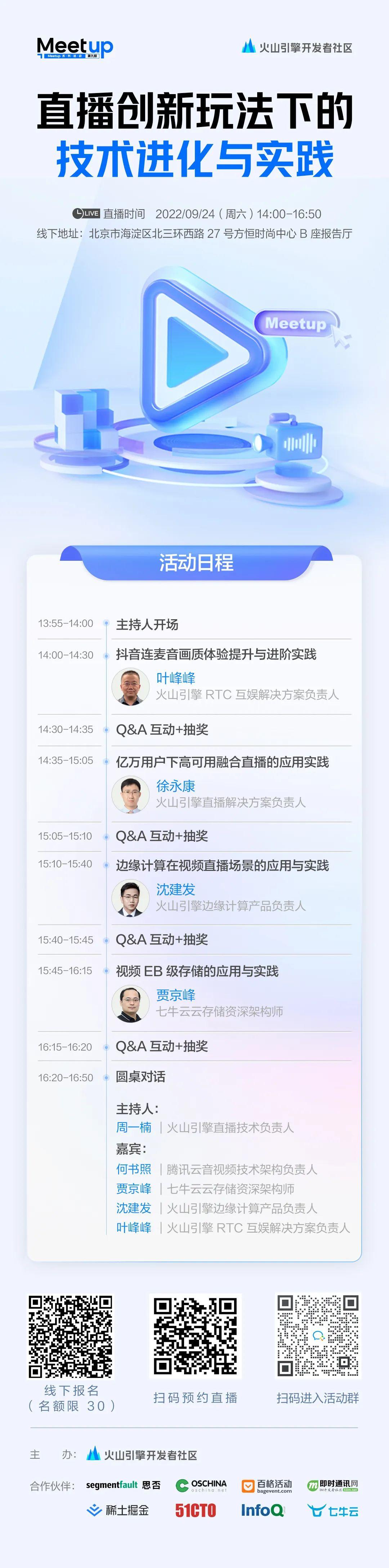 9 月 24 日,火山引擎开发者社区 Meetup 第九期将从抖音同款 RTC 能力、直播系统架构、边缘计算、视频云存储等方面为大家详细介绍直播创新玩法下的技术进化与实践。