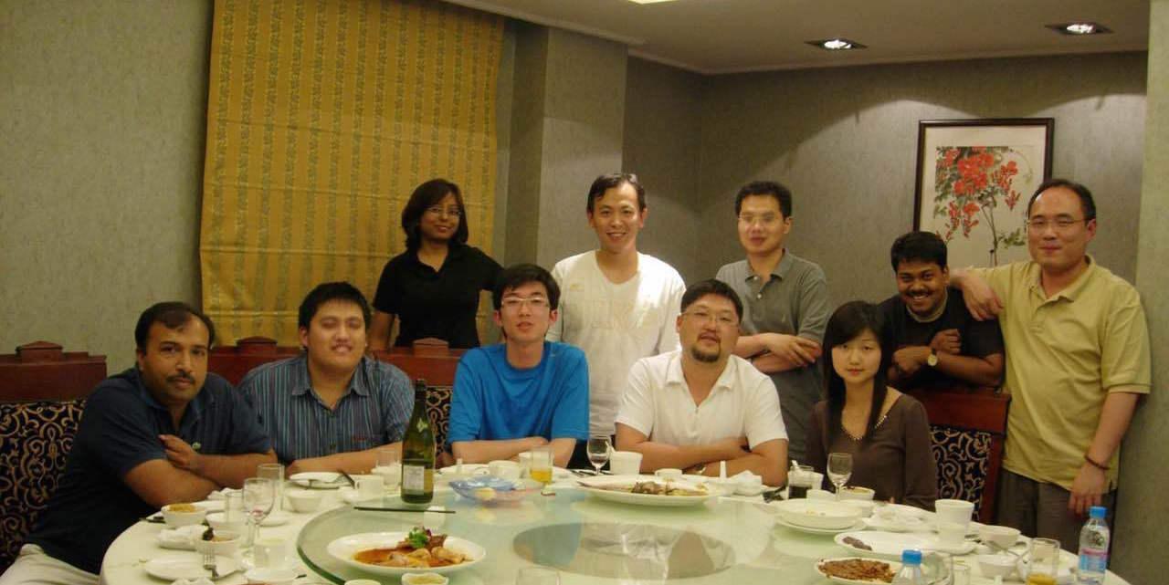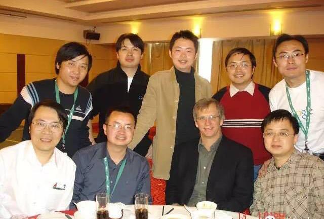 ▲ 2005 年谷歌中国北京团队第一次聚餐,廖溪和李开复挨着坐并合影。