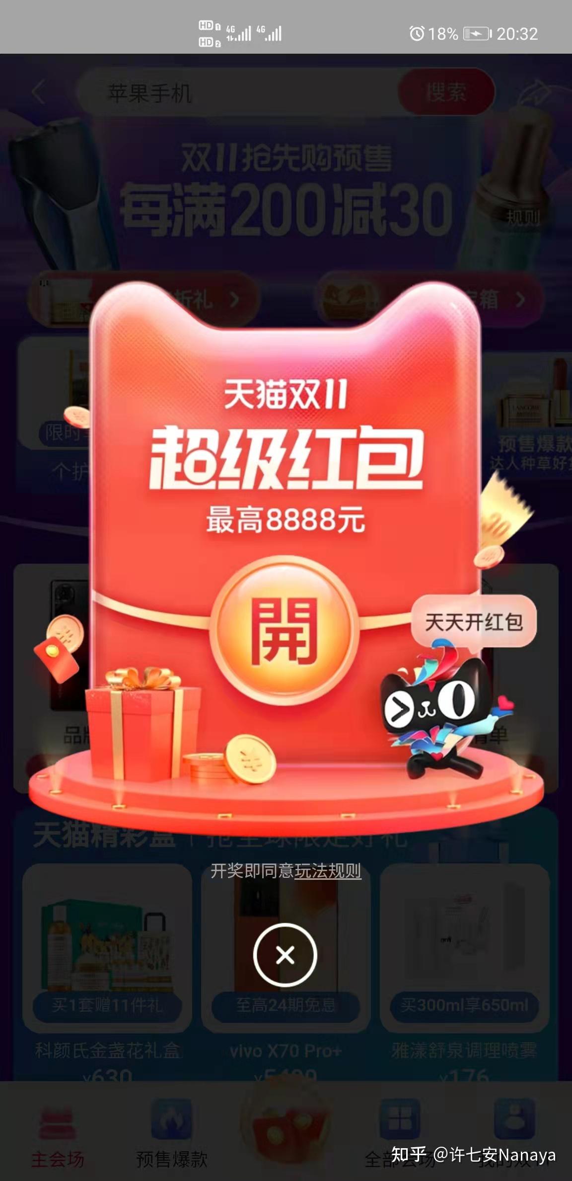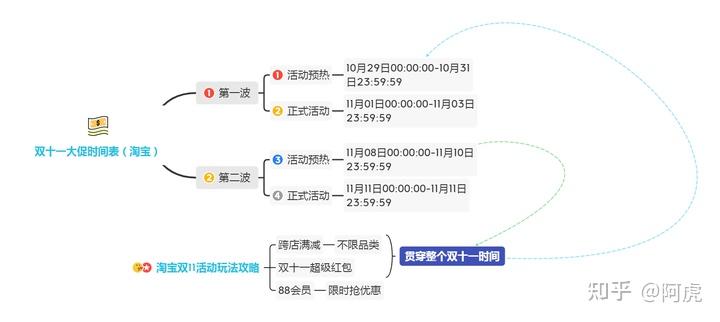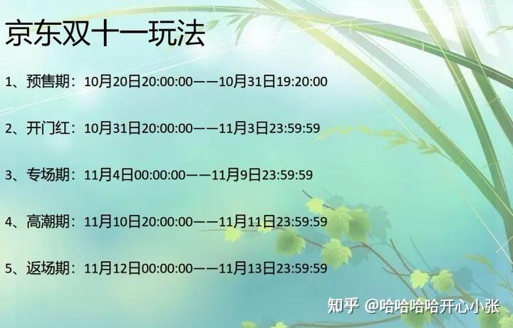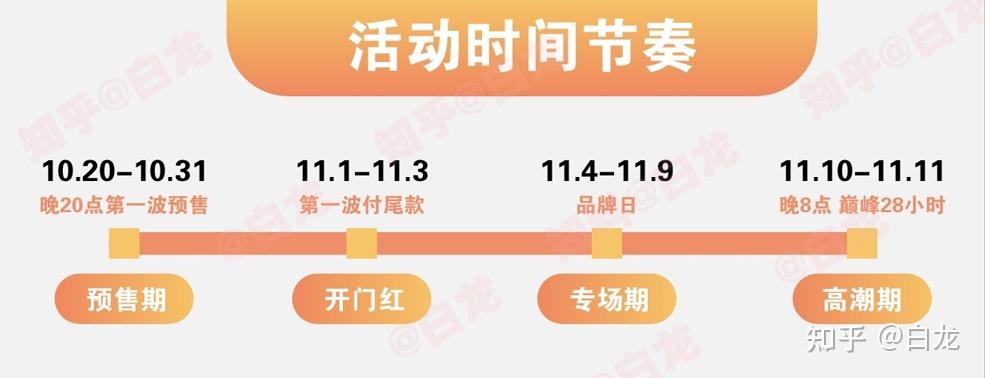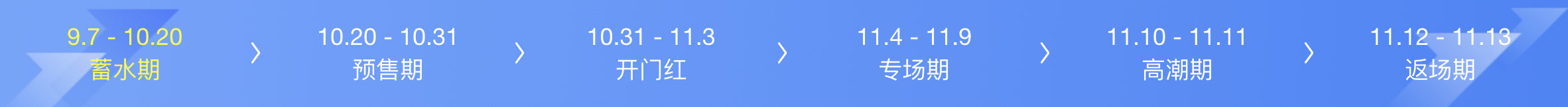 预售期:10月20日20:00:00——10月31日19:20:00 开门红:10月31日20:00:00——11月3日23:59:59 专场期:11月4日00:00:00——11月9日23:59:59 高潮期:11月10日20:00:00——11月11日23:59:59 返场期:11月12日00:00:00——11月13日23:59:59
