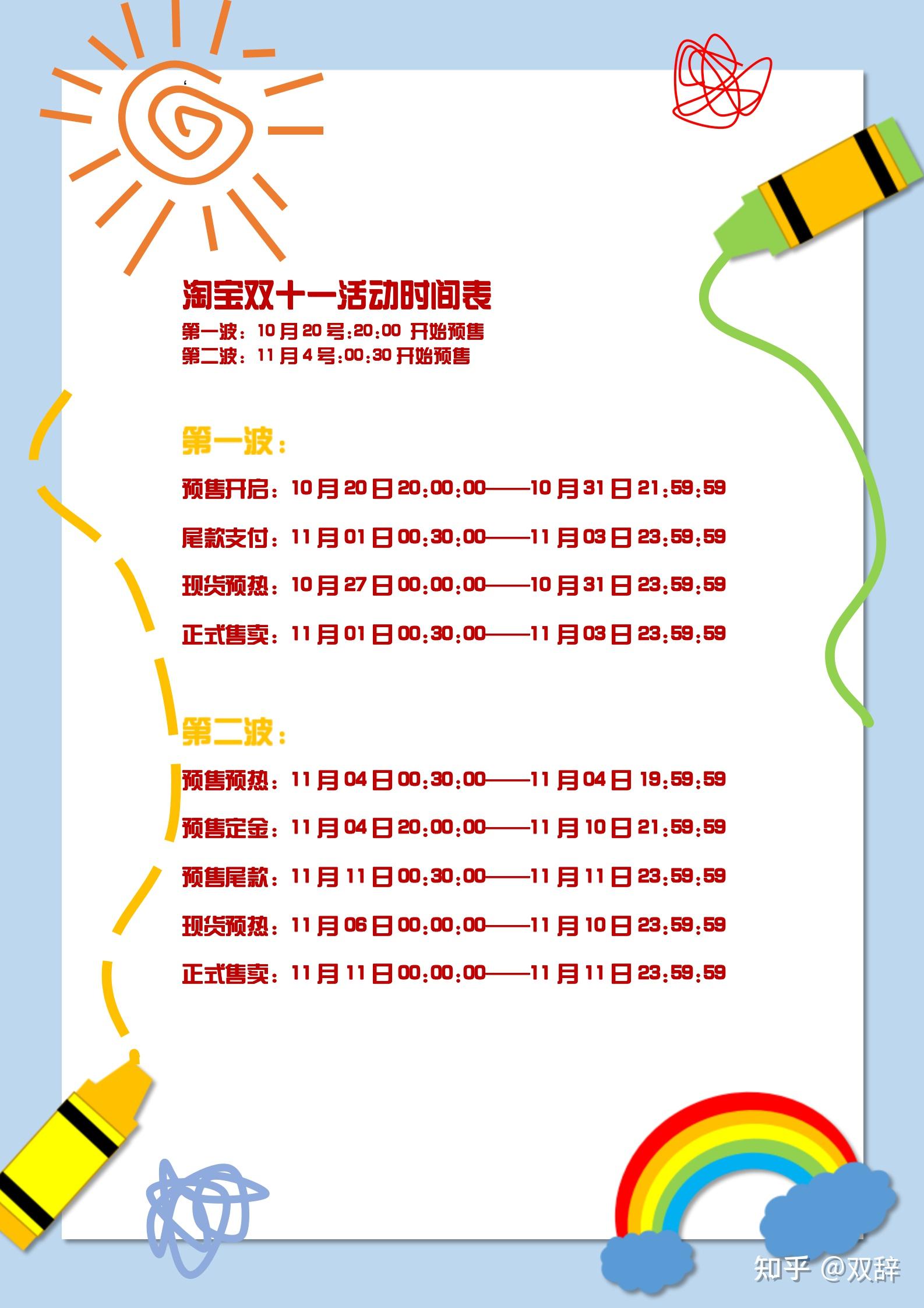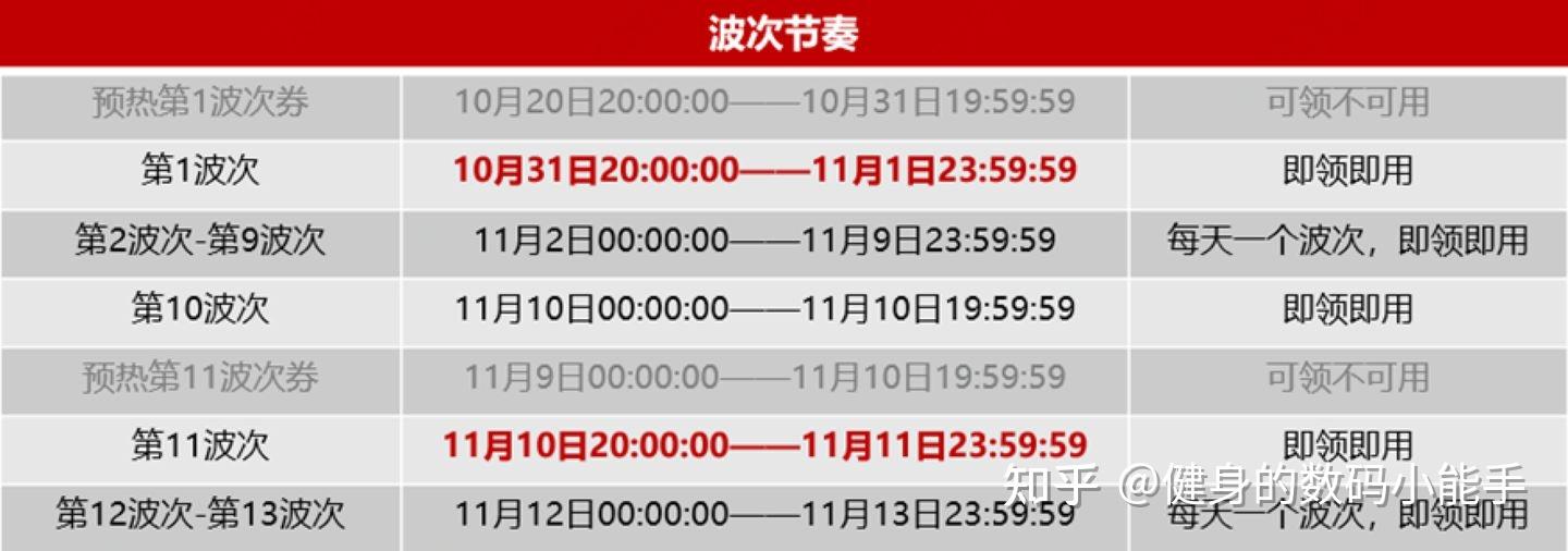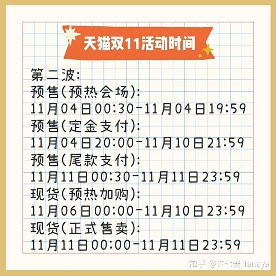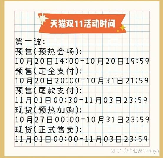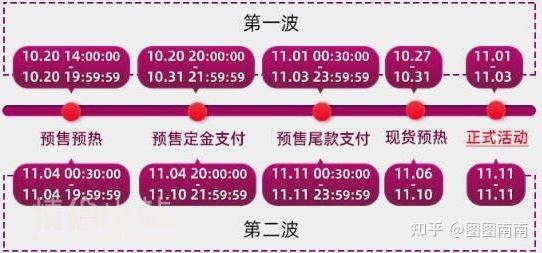 第一波预售(付定金):10月20日晚8点-10月31日 第一波预售(付尾款):11月1日 第二波:11月3日-11月10日 第二波:11月10号晚8点--11月11日