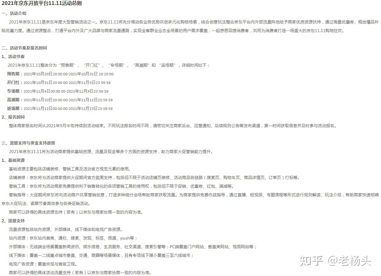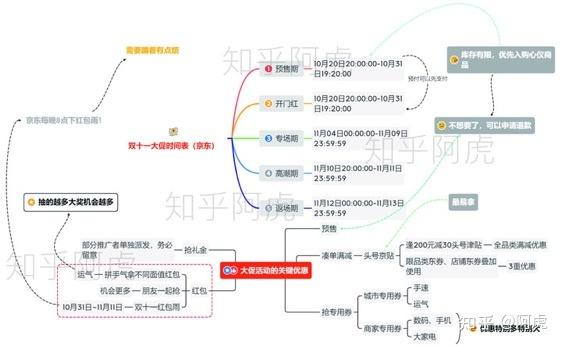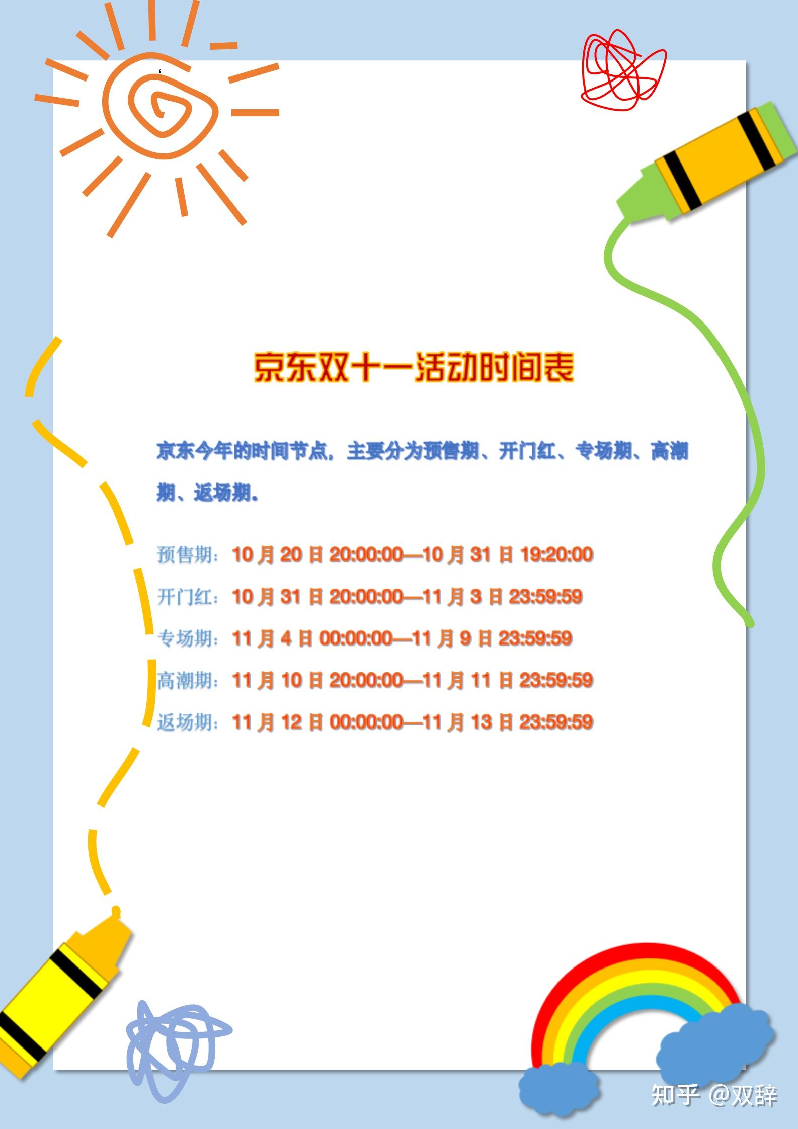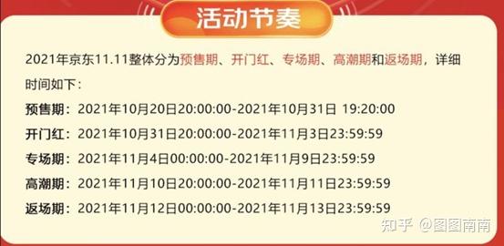 京东的预售和淘宝同步,提前到晚上8点开始。 预售期:10月20日(20:00)-10月31日)19:20) 开门红:10月31日(20:00)-11月03日(23:59) 专场期:11月04日(00:00)-11月09日(23:59) 高潮期:11月10日(20:00)-11月11日(23:59) 返场期:11月12日(00:00)-11月13日(23:59)