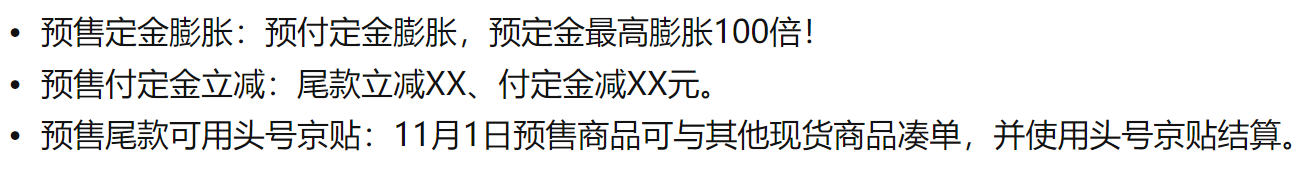 预售价格小于现货价格; 预售商品包邮; 预售商品享受保价;买贵了可以退差价 定金立减; 部分商品尾款可用头号京贴【每满300减40】 商品库存有限,心仪商品可能提早卖完